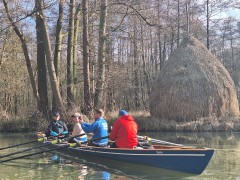 Wir ruderten von dort an, bei leicht kühlen Temperaturen, über das Lehder Fließ Süd, Schleuse Lübbenau, die Hauptspree entlang bis zum Leiper Wehr (Schleusung).
